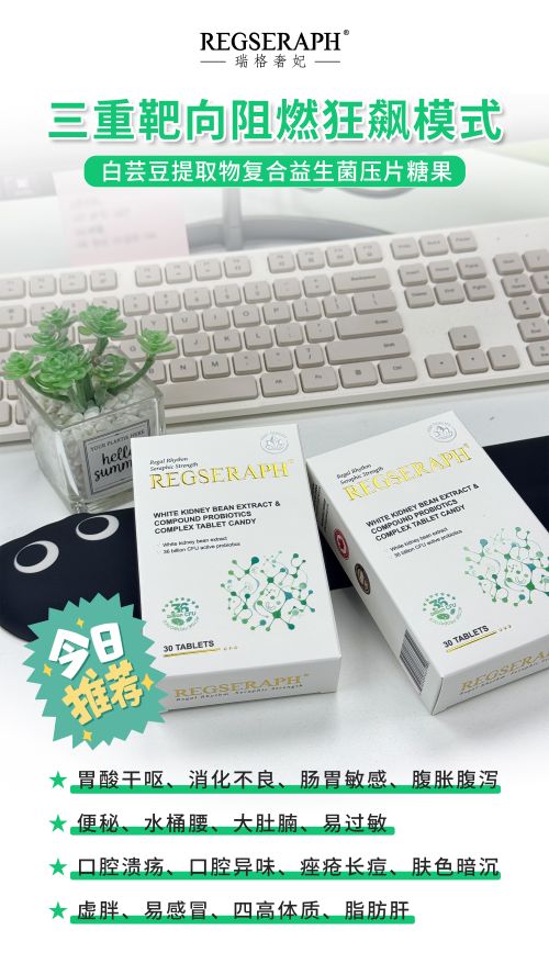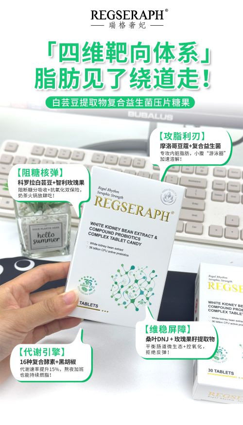 REGSERAPH瑞格奢妃品牌白芸豆提取物复合益生菌压片糖果,采用三重靶向阻燃科技,阻糖、断脂、激代谢,燃脂续航力拉满。甄选白芸豆、桑叶提取物、摩洛哥豆蔻、360亿益生菌、16种复合酵素、黑胡椒等成分,让脂肪见了绕道走。
