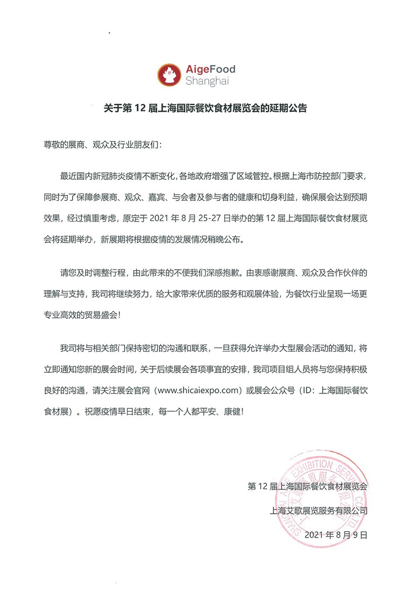 最近国内新冠肺炎疫情不断变化,各地政府增强了区域管控。根据上海市防控部门要求,同时为了保障参展商、观众、嘉宾、与会者及参与者的健康和切身利益,确保展会达到预期效果,经过慎重考虑,原定于2021年8月25-27日举办的第12届上海国际餐饮食材展览会将延期举办,新展期将根据疫情的发展情况稍晚公布。
