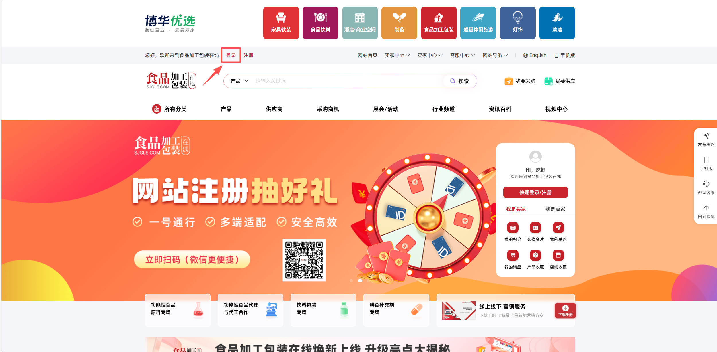 访问SJGLE食品加工包装在线:https://www.sjgle.com/,点击首页顶部“登录”或右侧“一键登录”按钮登录,通过以下三种登录方式登录用户中心。
