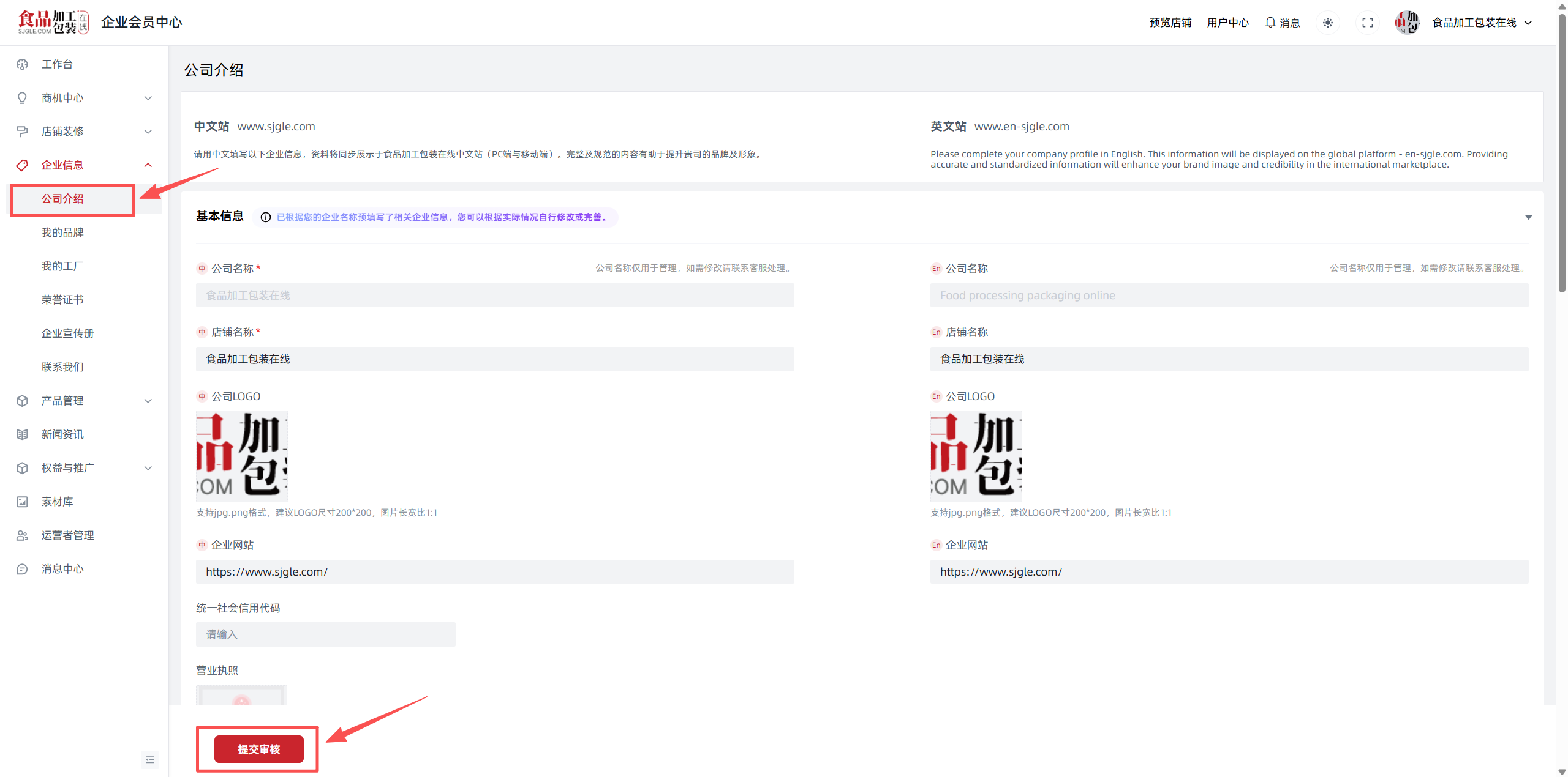 点击“企业中心--企业信息--公司介绍”,填写企业基本信息:店铺名称、企业类型、成立年份、工商注册号、主营产品、品牌名称、公司简介等信息,并且上传公司 logo(带*为必填项),点击【提交审核】按钮即可完善企业资料。