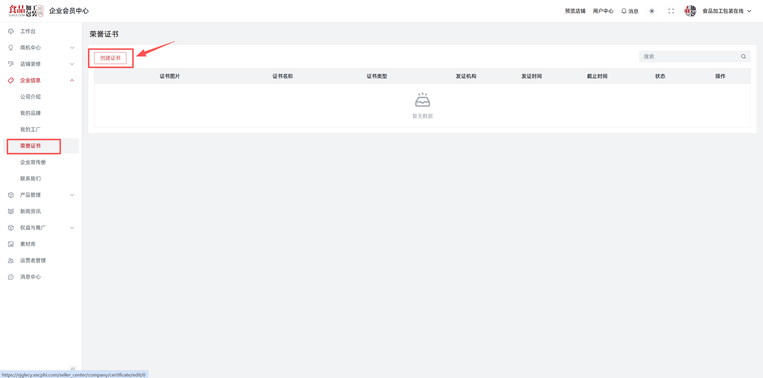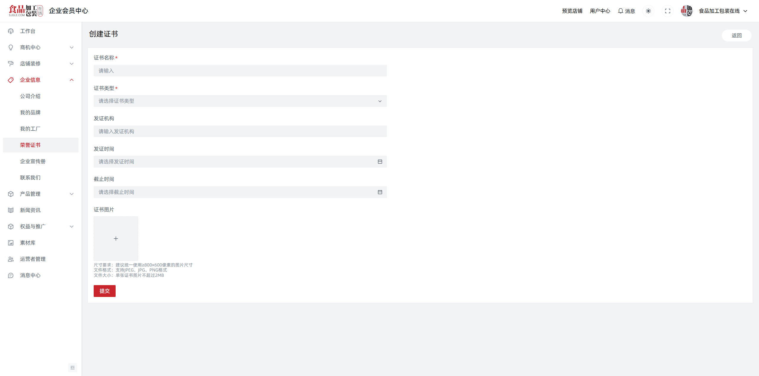 点击“企业信息--荣誉证书--创建证书”,即可上传贵司的企业证书、产品证书、经营许可证和其他证书。