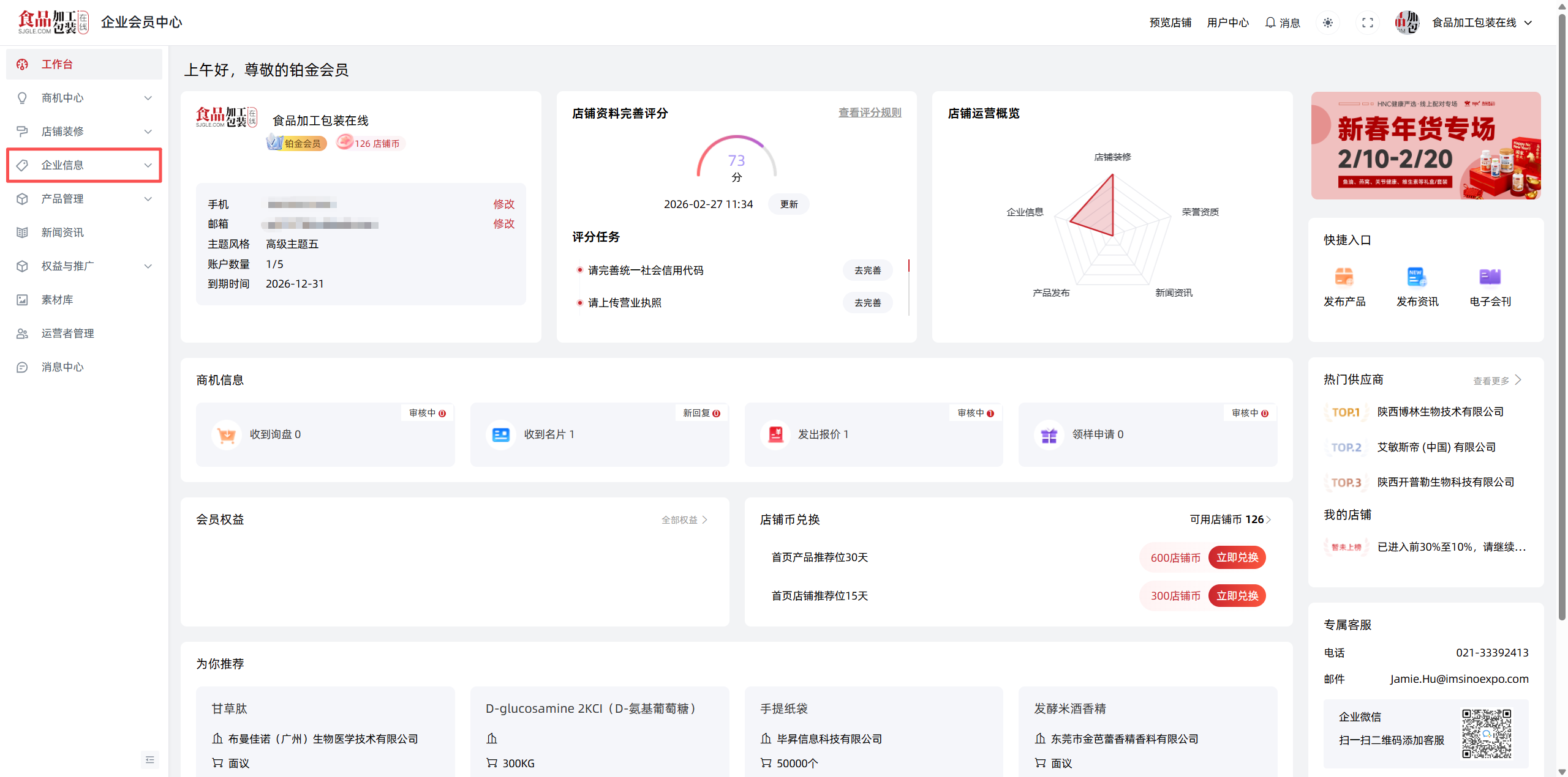 同时,工作台还整合了店铺资料完善、运营数据概览、店铺币兑换、专属客服对接等辅助功能,让你在统筹四大核心业务的同时,可一站式完成店铺基础管理、权益兑换与问题咨询,全方位赋能企业高效运营与商机转化。